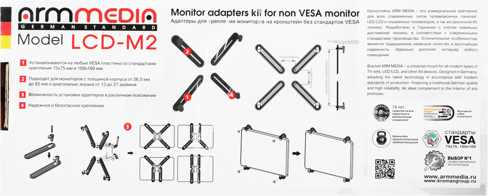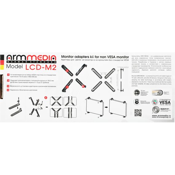 Комплект адаптеров для крепления мониторов на кронштейн без стандартов VESA Устанавливаются на любые VESA пластины со стандартами крепления 75х75 мм и 100х100 мм. Подходит для мониторов с толщиной корпуса от 26,5 мм до 65 мм и диагональю экрана от 13 до 27 дюймов