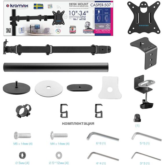 Кронштейн для мониторов Kromax CASPER-507 черный 10"-34" макс.10кг настольный поворот и наклон [90420]