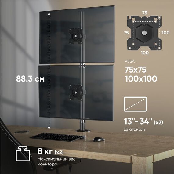 Кронштейн для мониторов ONKRON D208E черный 13"-34" макс.16кг настольный поворот и наклон