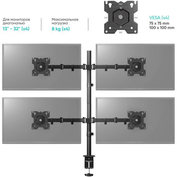 Настольный кронштейн для четырех мониторов, ONKRON D421E подходит для мониторов и телевизоров диагональю от 13 до 32 дюймов и весом до 8 кг на каждый.