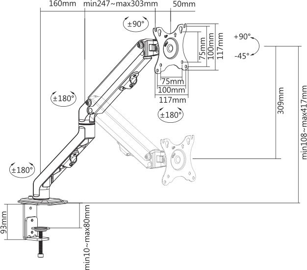| Особенности | Настольный кронштейн для монитора с системой газ-лифт. Пружинный механизм позволяет легко перемещаться вверх и вниз. |