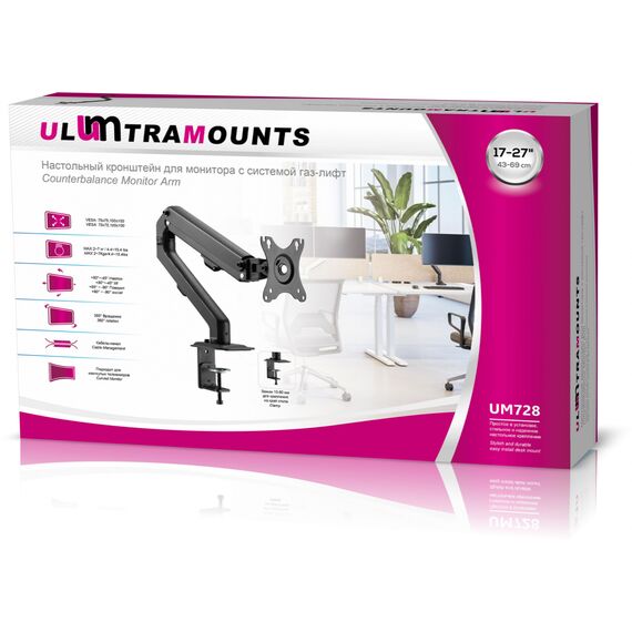Кронштейн для мониторов Ultramounts UM728 черный 17"-27" макс.7кг крепление к столешнице поворот и наклон