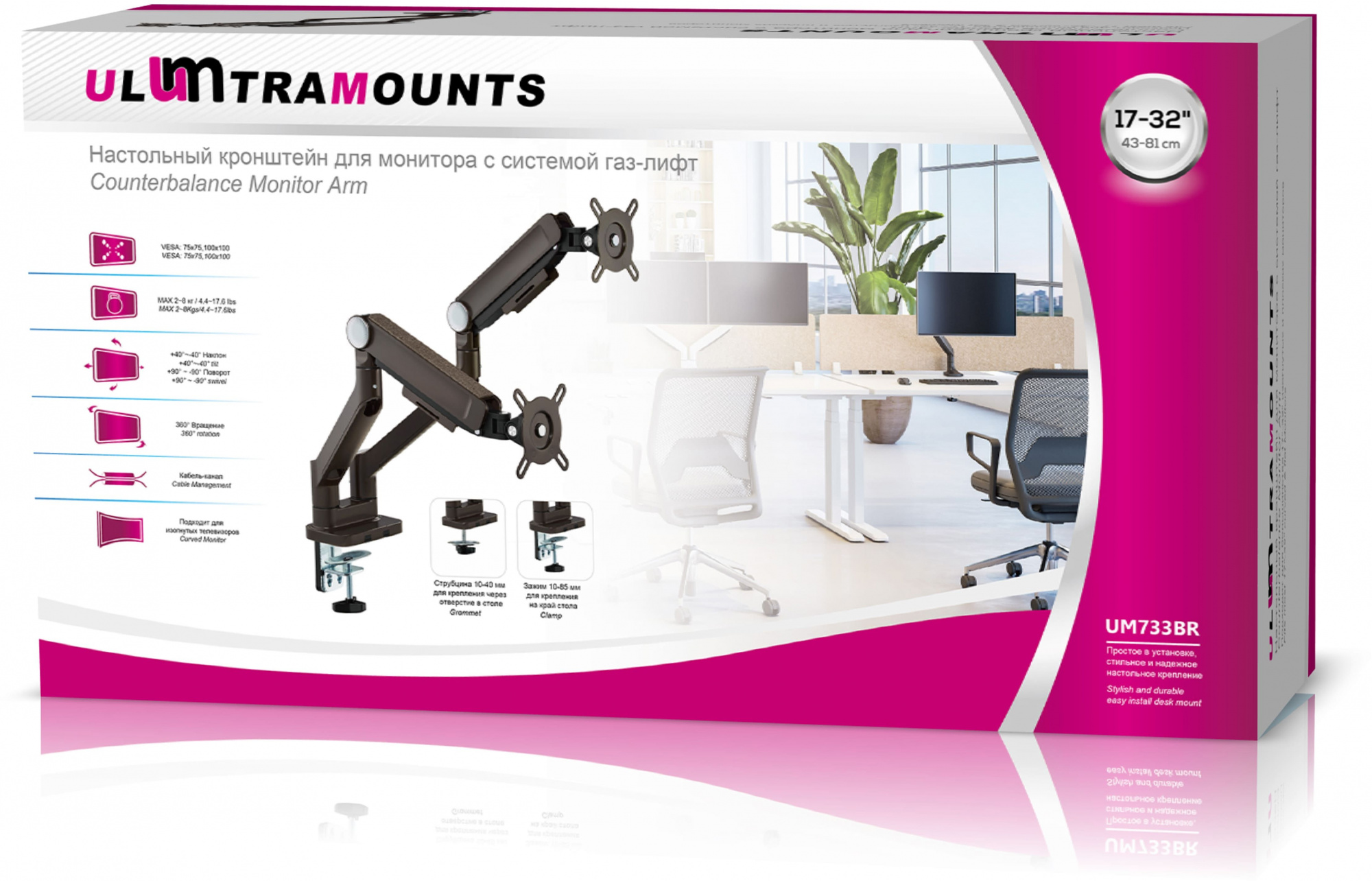 Кронштейн для мониторов Ultramounts UM733BR черный/коричневый 17-32 макс.8кг крепление к столешнице поворот и наклон