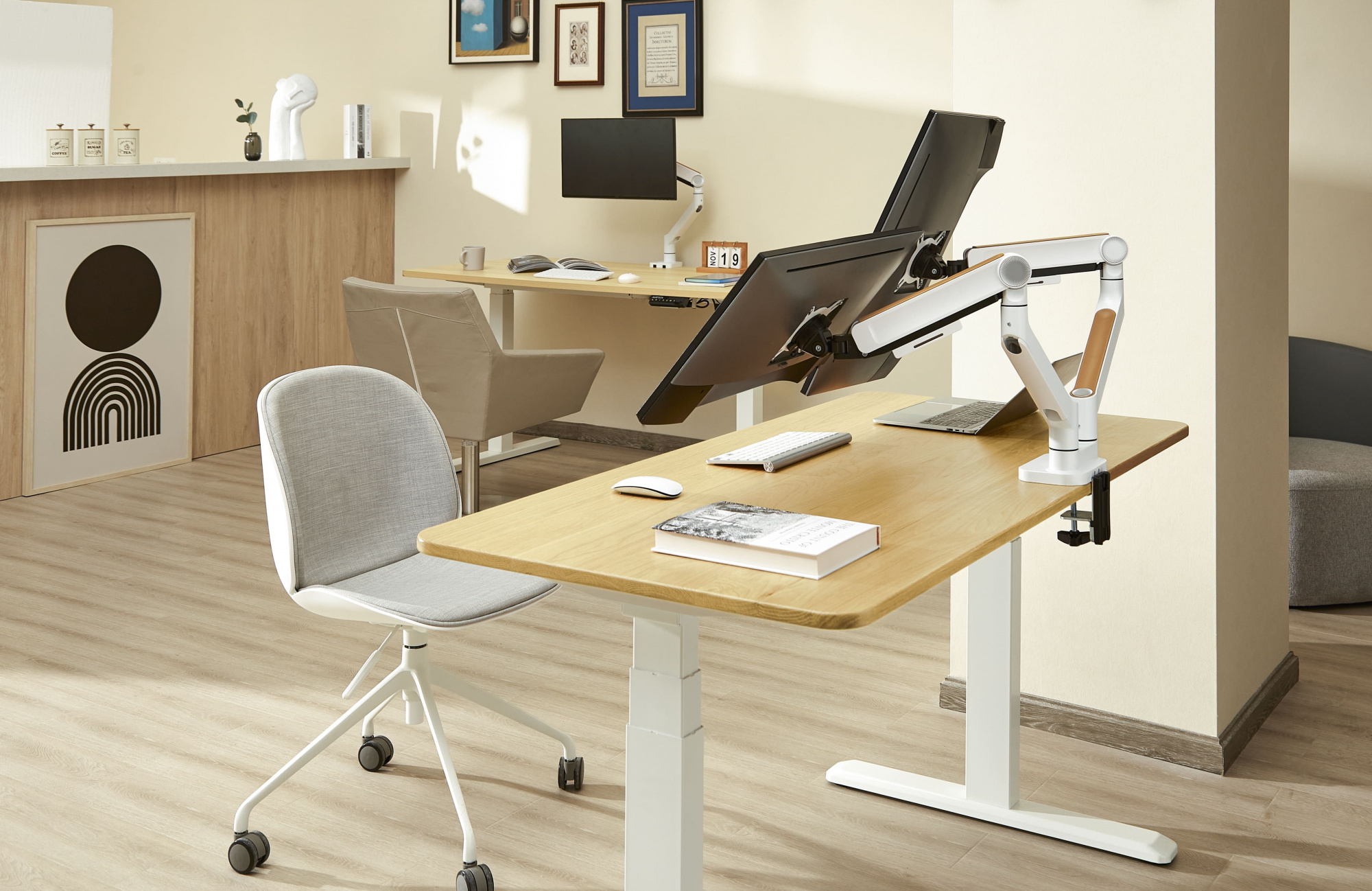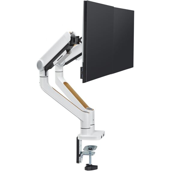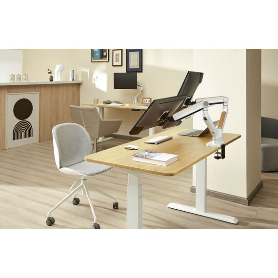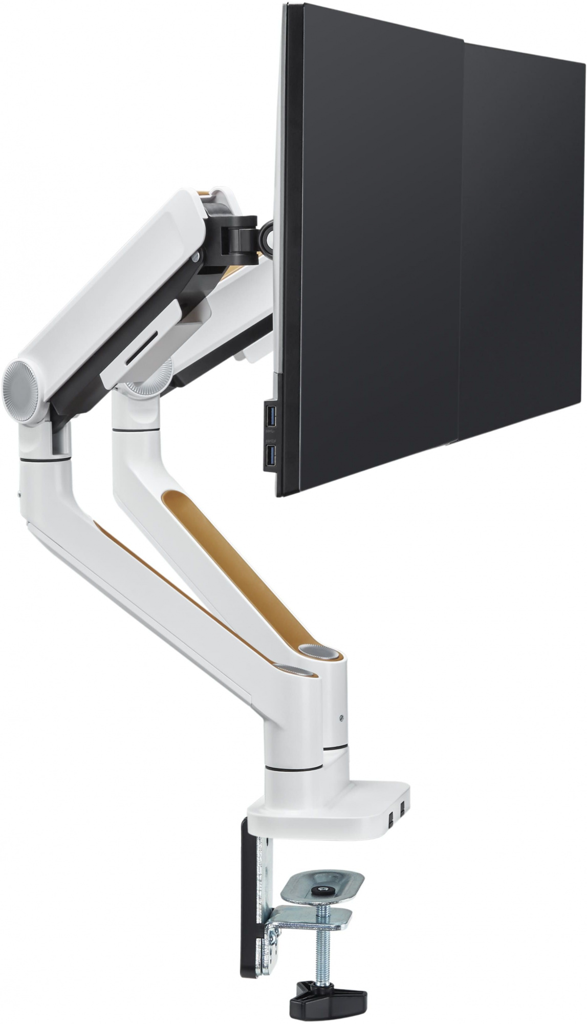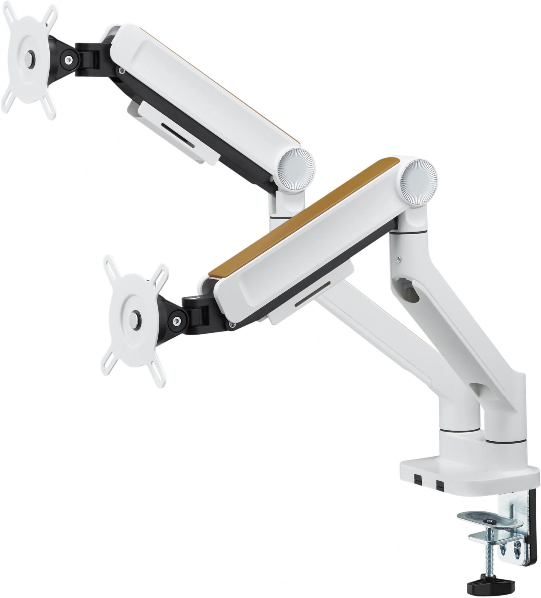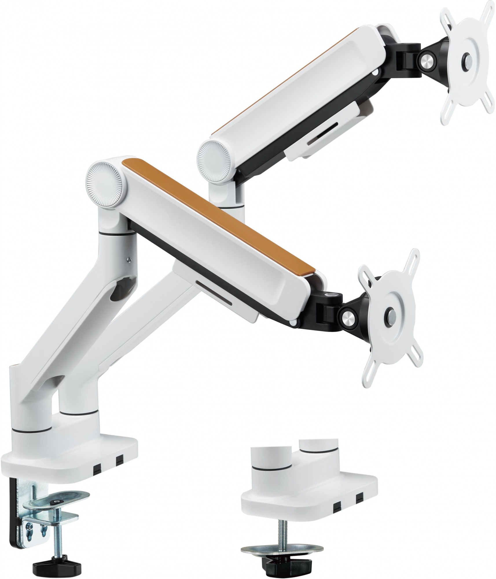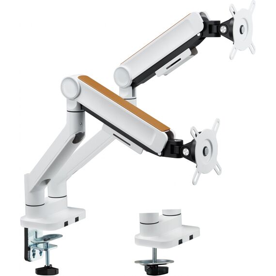 Настольный кронштейн для мониторов с системой газлифтов и встроенными пружинными механизмами для регулировки веса обеспечивает надежное крепление и позволяет изменять положение экранов по высоте и наклону.