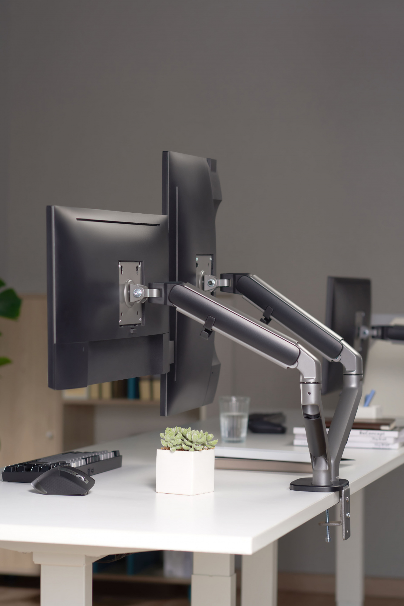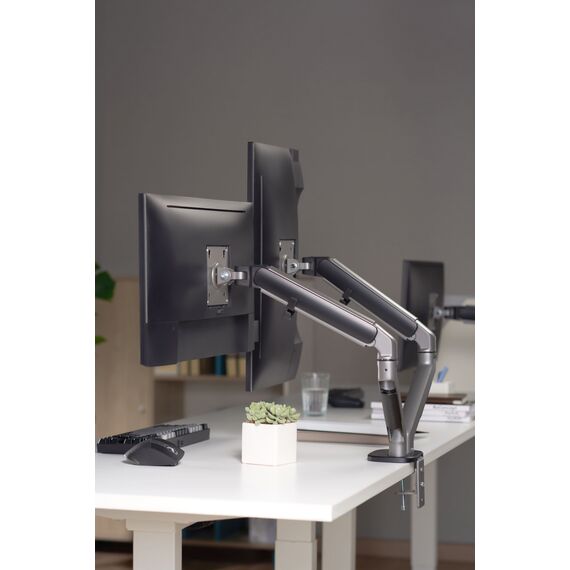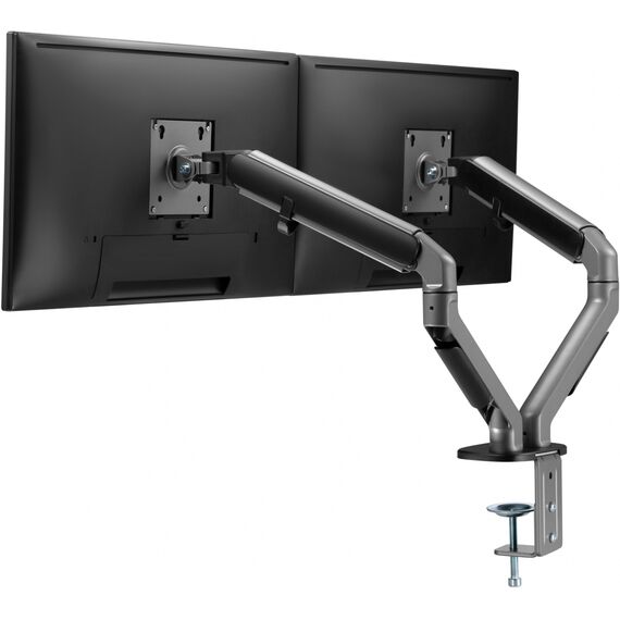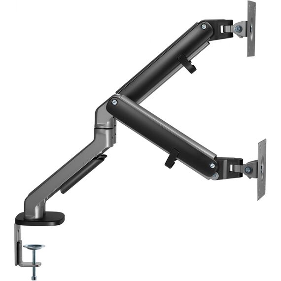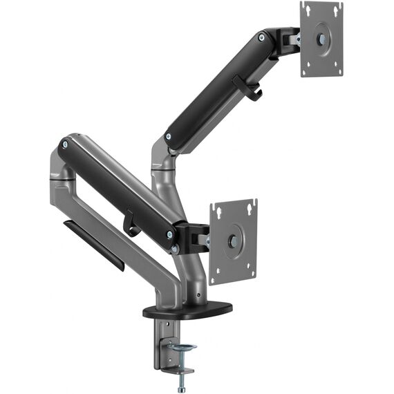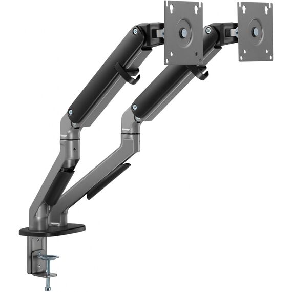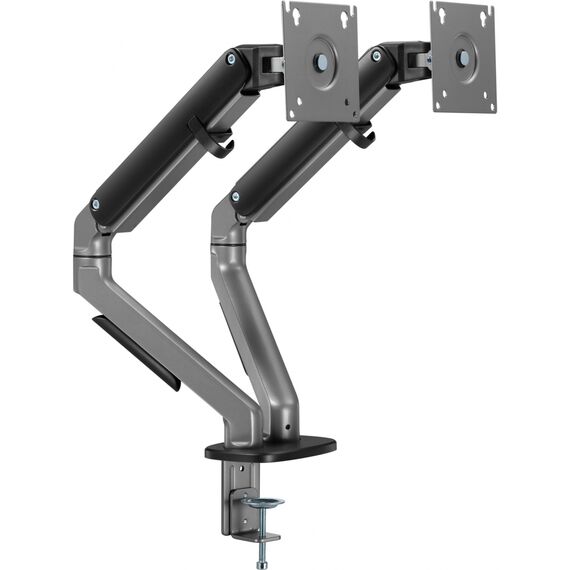 | Особенности | Настольный кронштейн с двумя креплениями под мониторы. Встроенный пружинный механизм натяжения поможет для идеальной регулировки веса. |