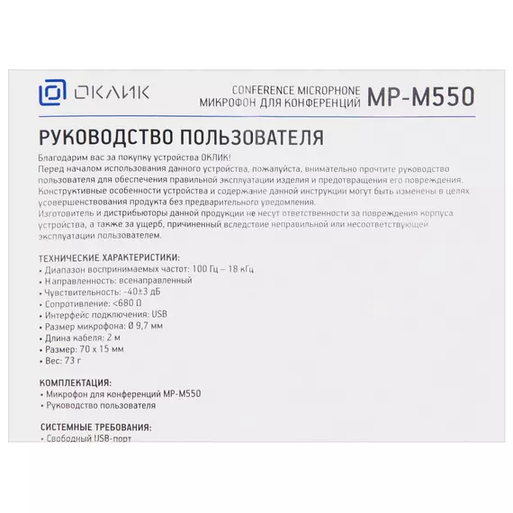 | Особенности | Выносной микрофон расширяет возможности видео- и аудио- конференций в комнате для переговоров.Всенапрвленный конденсаторный микрофон позволяет увеличить и улучшить качество принимаего сигнала |