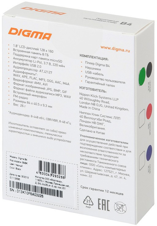 Проигрыватель Digma B4 MP3 Player, FM Tuner, 8Gb, MicroSD, LCD 1.8", диктофон, USB, Li-Pol [B4BK-Black]