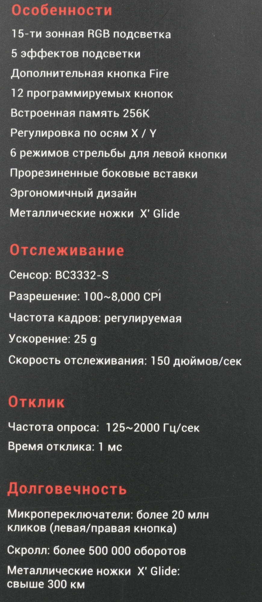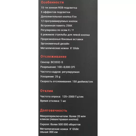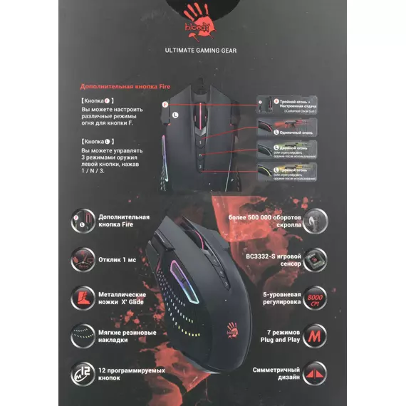 | Особенности | При установке ПО Bloody7, уровни core3,4 активированы бесплатно.15-ти зонная RGB подсветка5 эффектов подсветкиДополнительная кнопка FireВстроенная память 256K6 режимов стрельбы для левой кнопкиМеталлические ножки X' Glide |