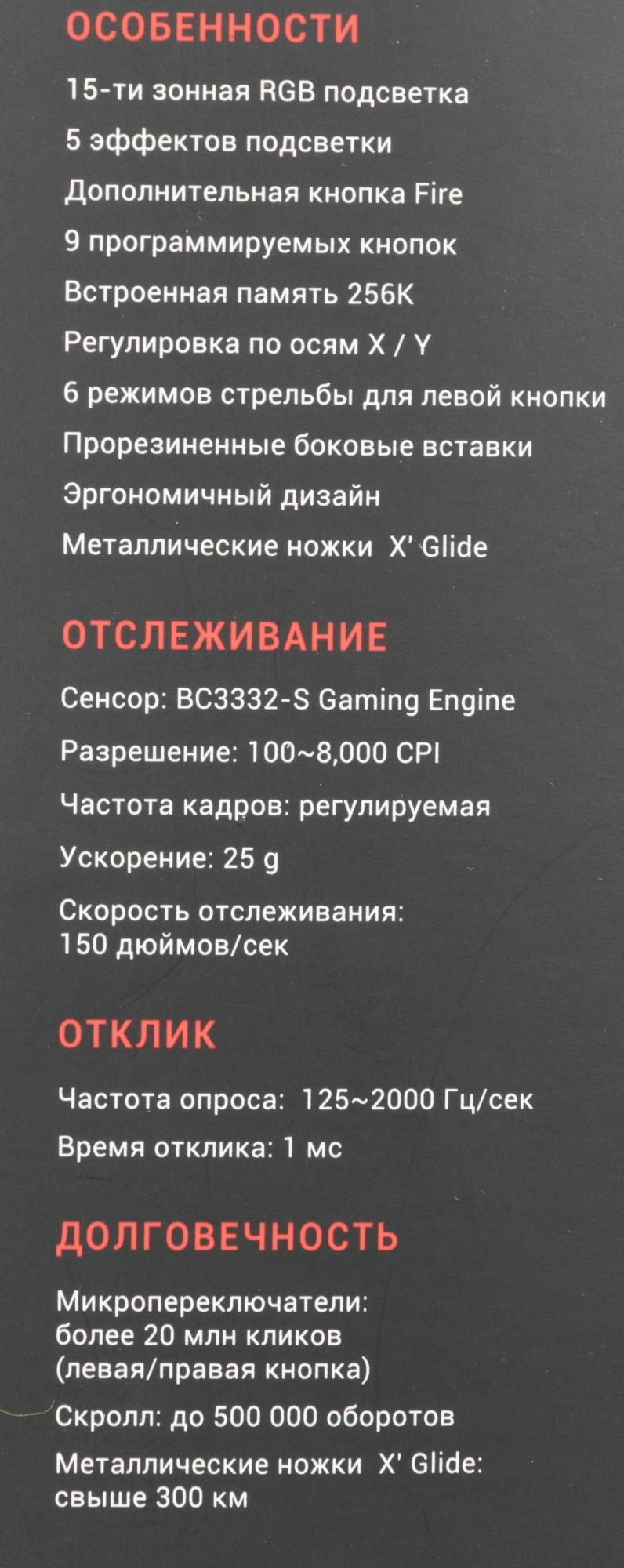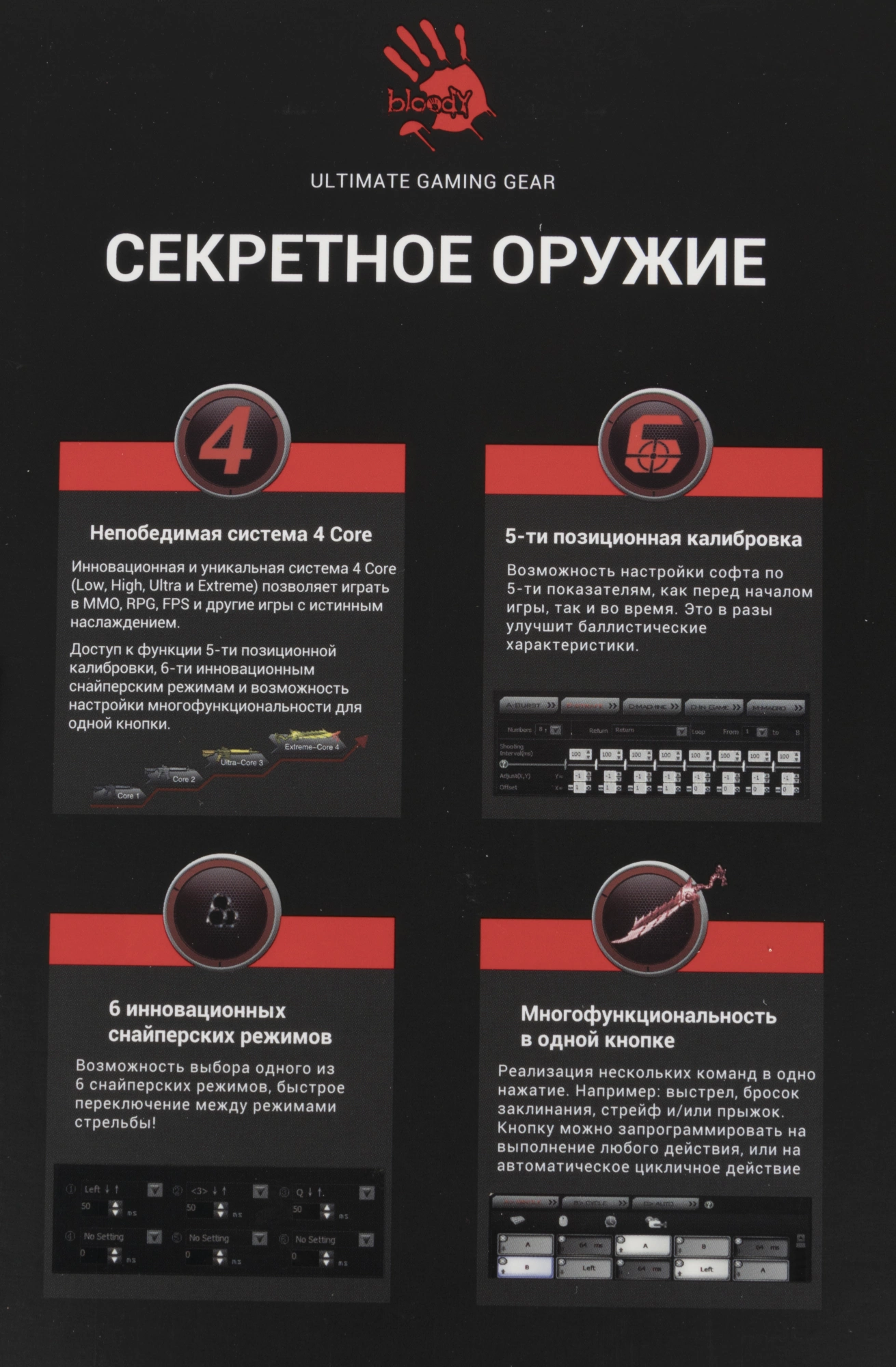 | Особенности | Сенсор: BC3332-S Gaming Engine15-ти зонная RGB-подсветка5 эффектов подсветкиДополнительная кнопка FireВстроенная память 256K6 режимов стрельбы для левой кнопкипри установке ПО Bloody7, уровни core3,4 активированы бесплатно |