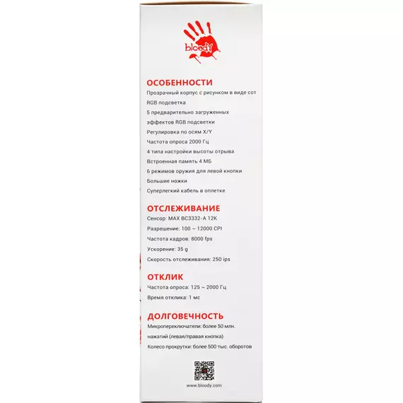 | Особенности | Игровой сенсор Max BC3332-A, расцветка Naraka, активирована система Bloody Core 3,4 |