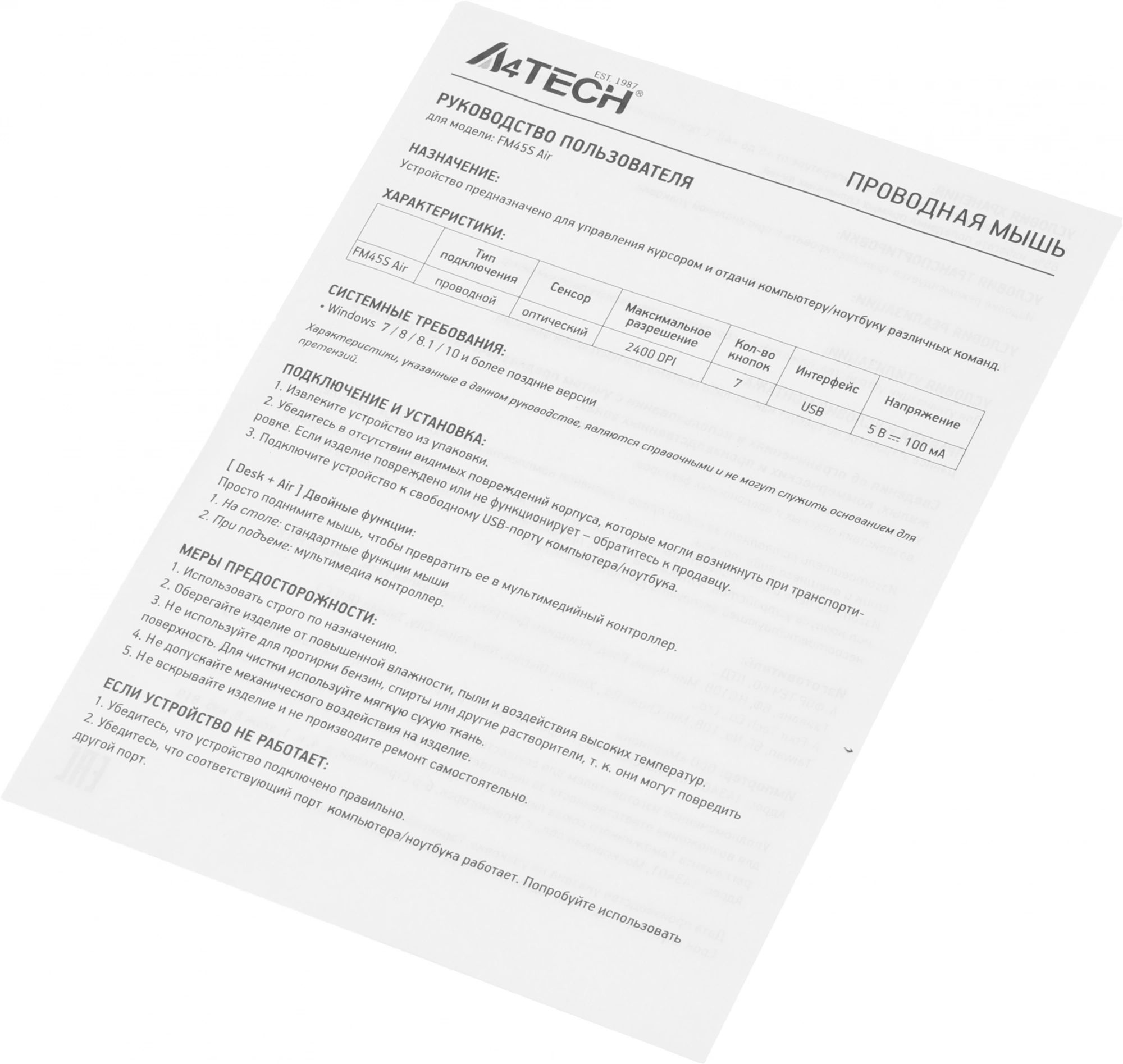 | Частота опроса USB порта | 125 Гц |