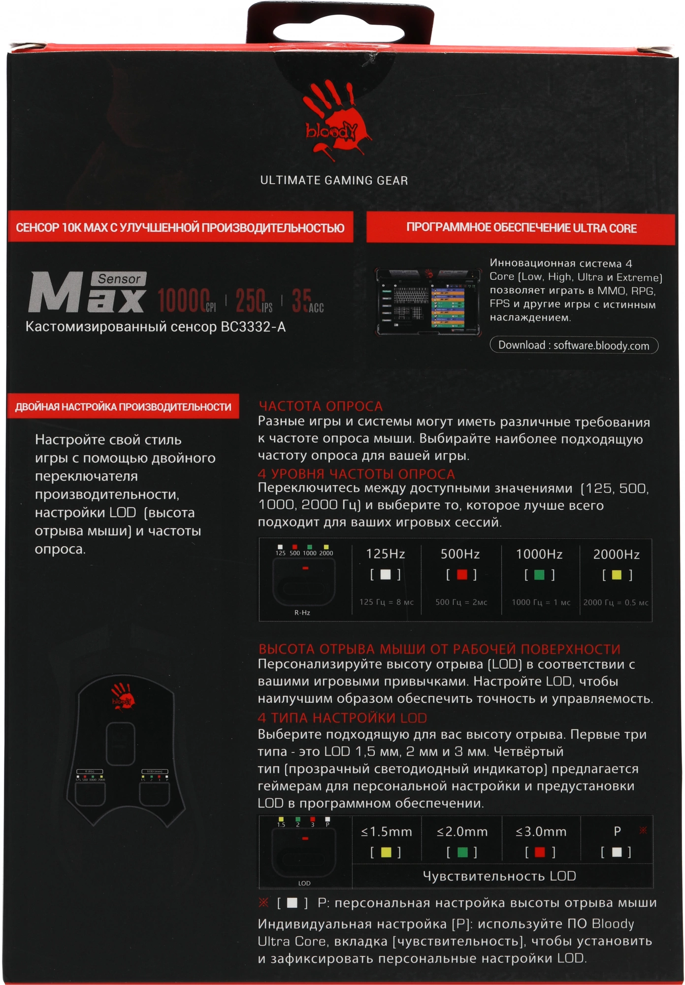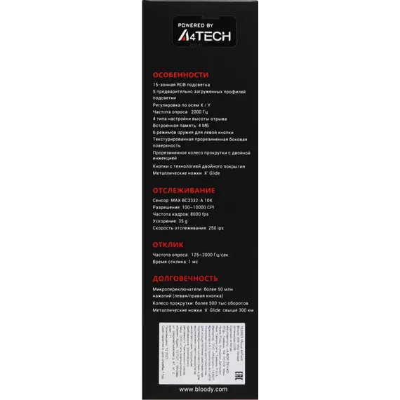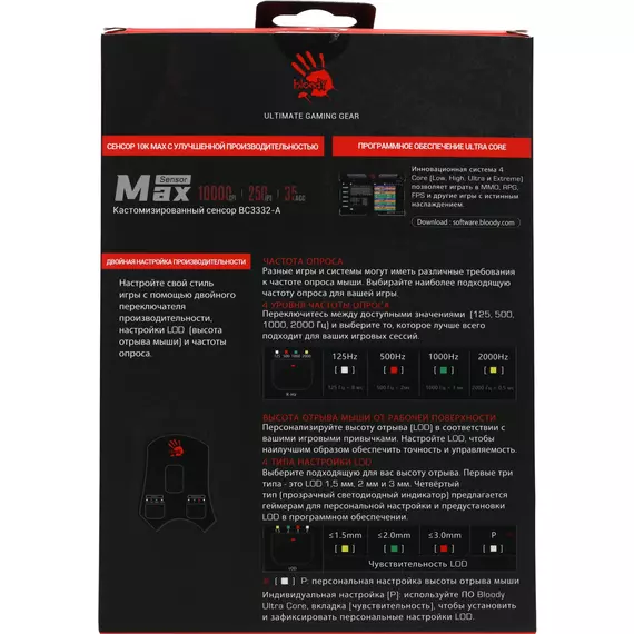 | Особенности | Кастомизированный сенсор MAX BC3332-A 10K, 8000 FPS, 250 IPS, регулируемая высота отрыва, 5 профилей RGB подстветки, время отклика: 1 мс, металлические ножки. при установке ПО Bloody7, уровни core3,4 активированы бесплатно |