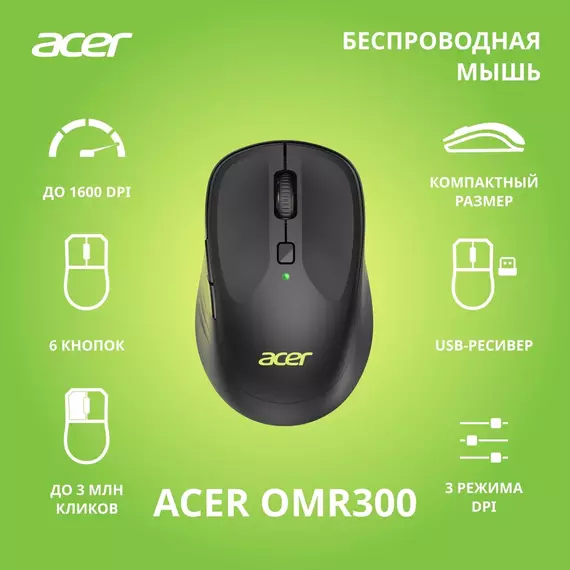 Мышь Acer OMR300 черный оптическая 1600dpi беспров. USB 6but [ZL.MCECC.01R]