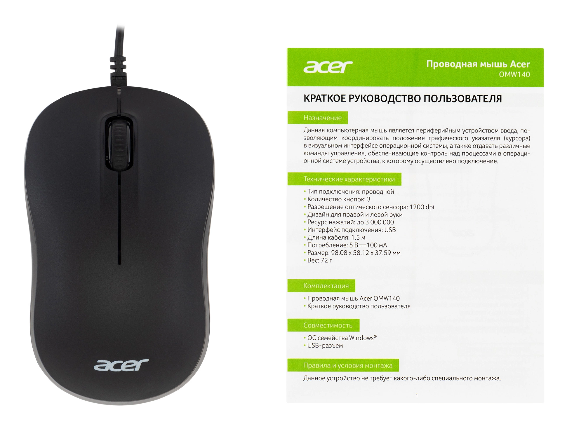 Мышь Acer OMW140 черный оптическая 1200dpi USB 3but [ZL.MCEEE.00L]