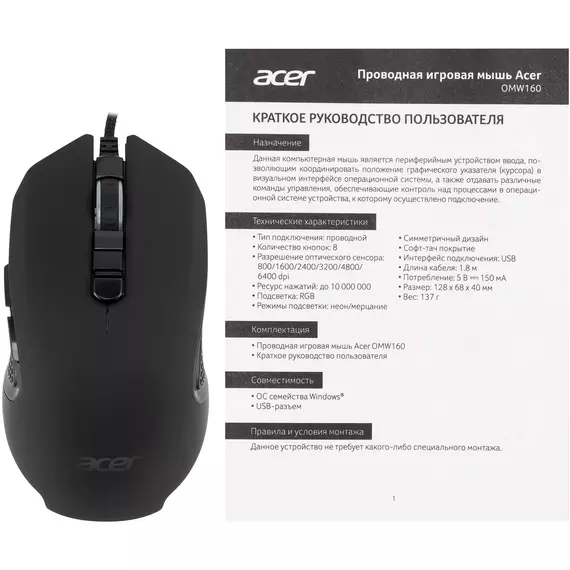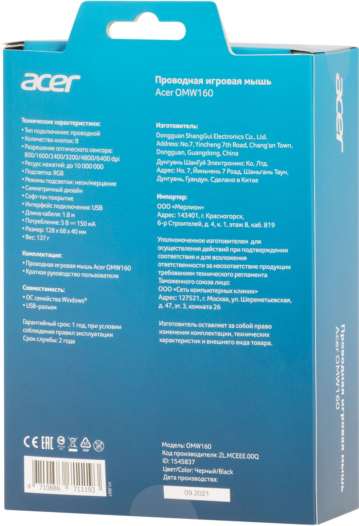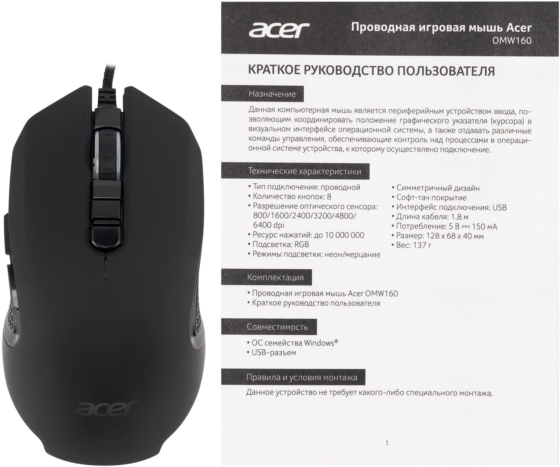 Мышь Acer OMW160 черный оптическая 6400dpi USB 8but [ZL.MCEEE.00Q]