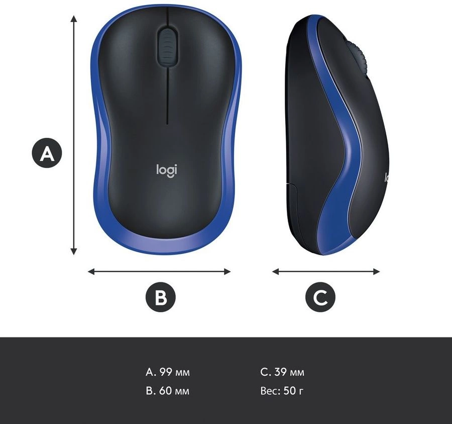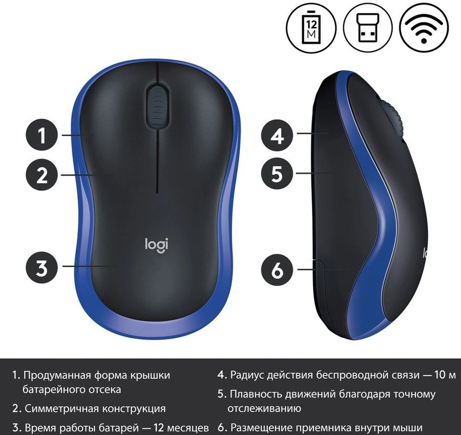 Мышь Logitech M185 черный/синий оптическая 1000dpi беспров. USB1.1 для ноутбука 2but [910-002632]