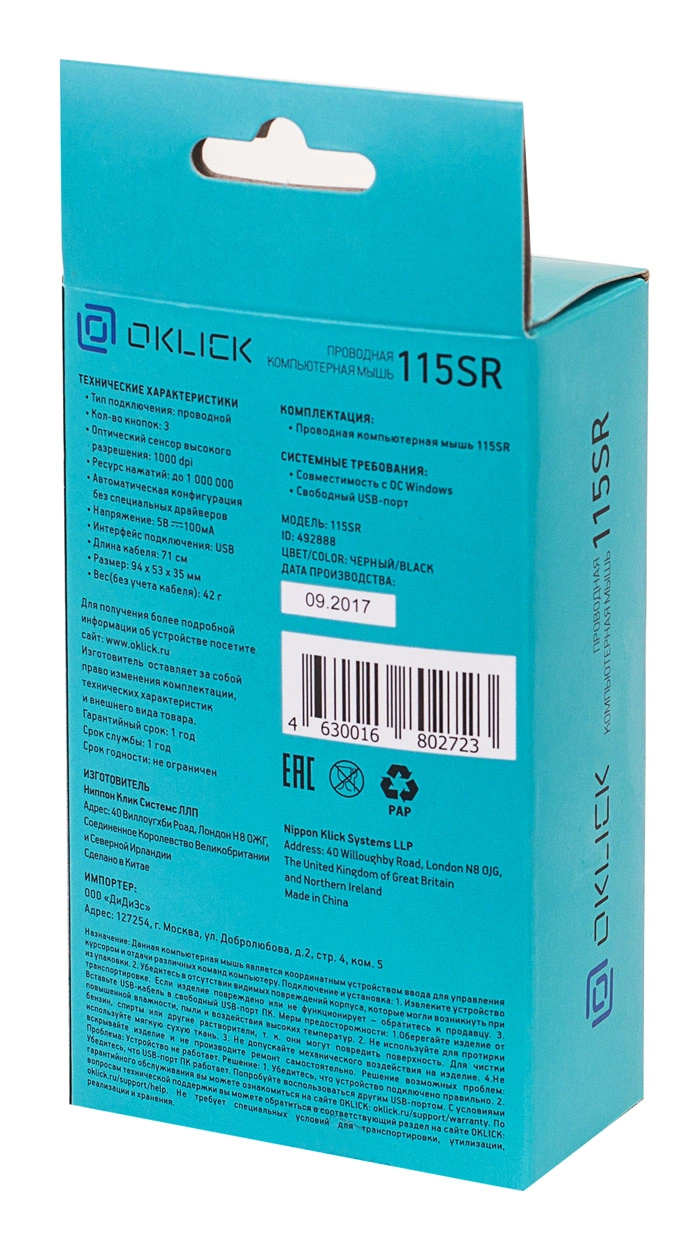 | Размеры мыши | 53x94x35мм |