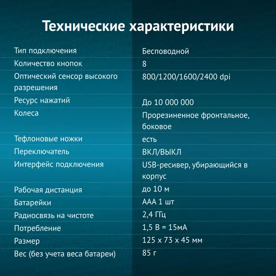 | Особенности | Эргономичная беспроводная компьютерная мышь с удобным дополнительным функционалом кнопок. Дополнительное боковое колесо прокрутки. Настраиваемое оптимальное разрешение. Надежные высокоресурсные кнопки (10 млн. кликов). Конструкция мышки позволяет использовать любую батарейку - АА или ААА. |