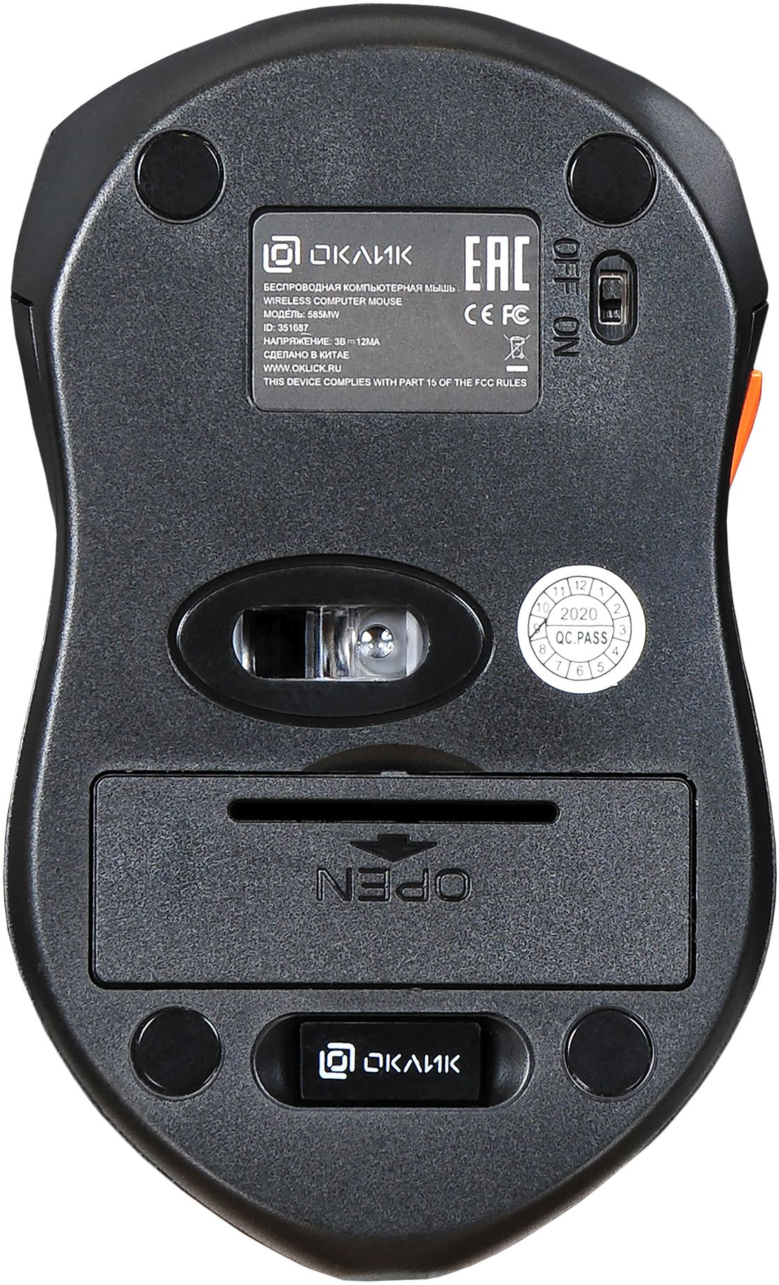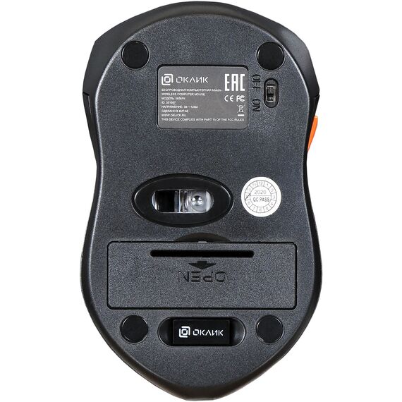 Oklick 585MW подключается к ПК по радиоканалу 2,4 ГГц. В комплекте поставляется USB-ресивер, который легко убирается в корпус, и две мизинчиковые батарейки типа ААА.