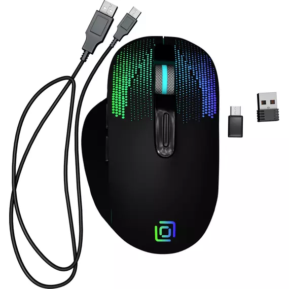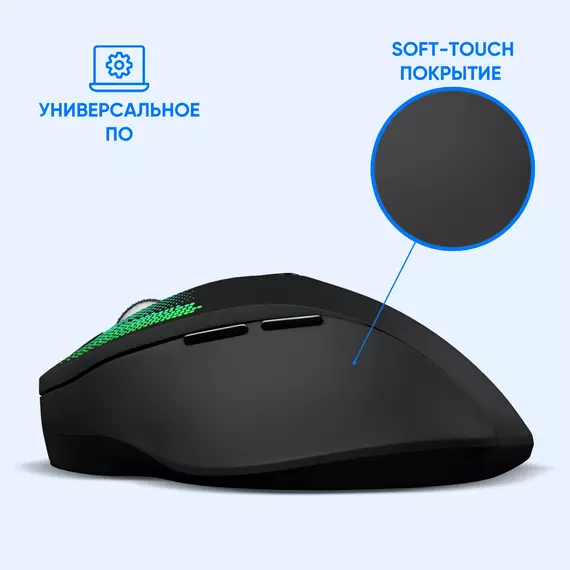 | Особенности | Аккумулятор Li-Pol 500 mAh, покрытие soft-touch, два ресивера тип USB-A и USB-C, встроенный аккумулятор,возможность отключения подсветки. Специальное ПО расширяющее функциональные возможности мышки. |