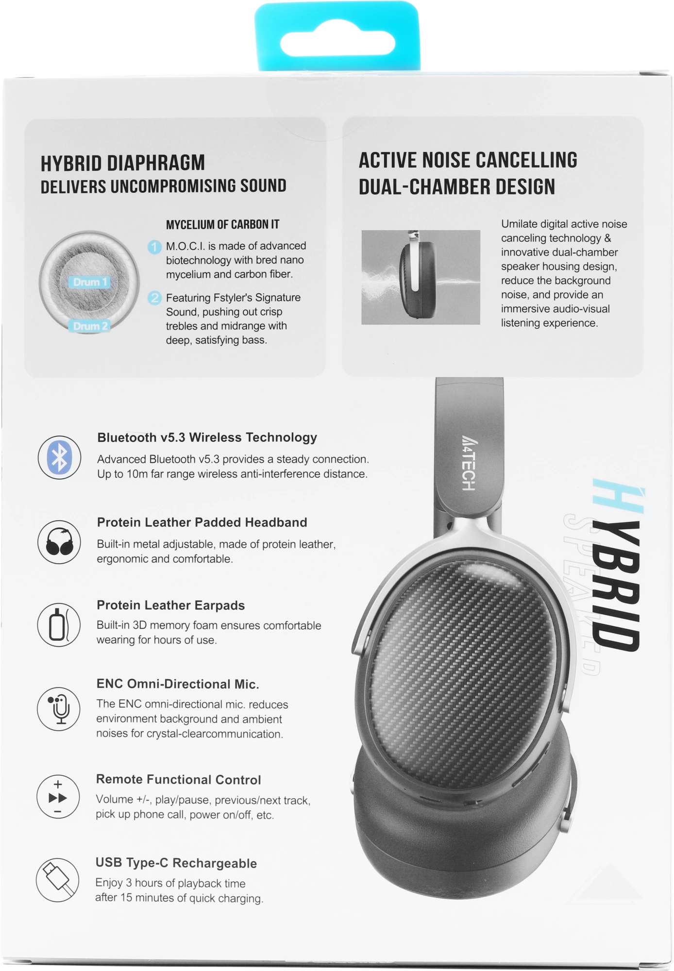 Технология ANC (активное шумоподавление). Динамик с гибридной диафрагмой 40 мм. Передача с низкой задержкой 45 мс. Инновационная двухкамерная конструкция. Регулируемая кожаная повязка на голову. Эргономичные 3D амбушюры из протеиновой кожи. Один микрофон.Технология шумоподавления окружающей среды