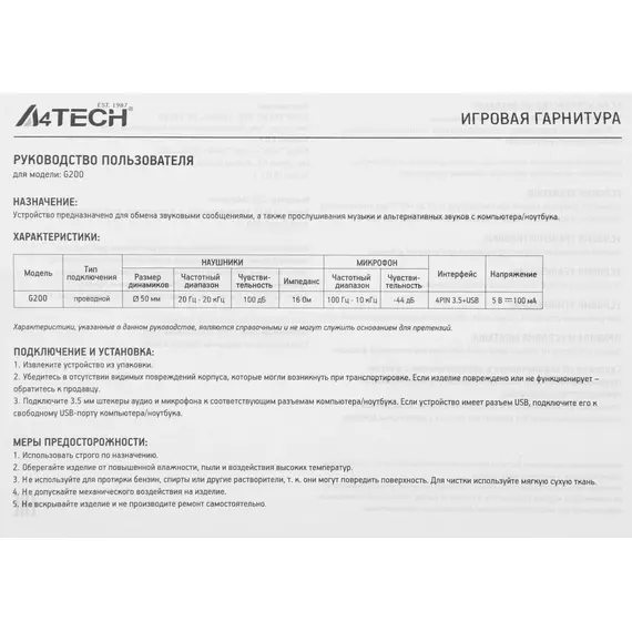 Описание A4-Tech G200 [AUX3.5-4PIN +USB]