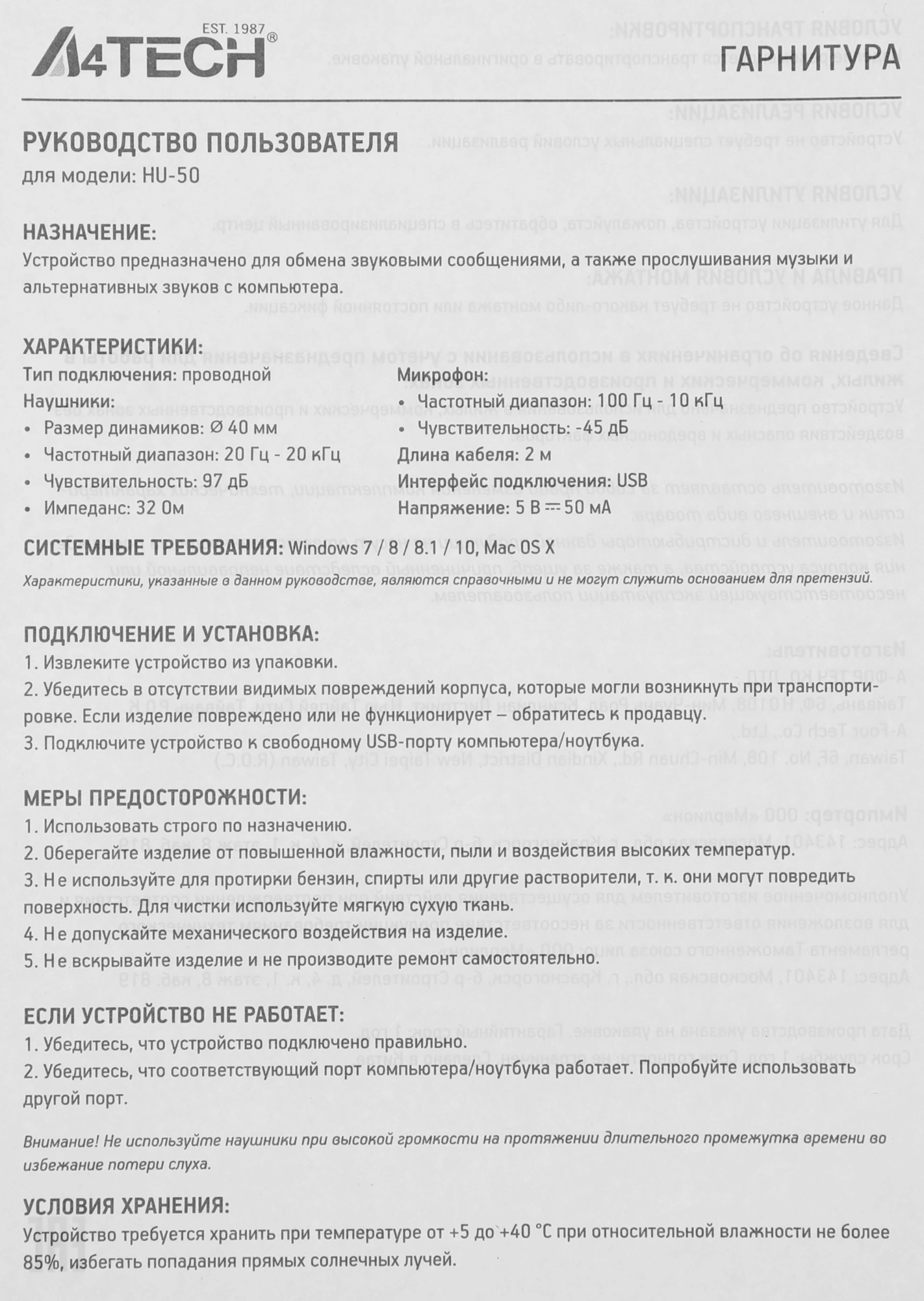Описание A4-Tech HU-50
