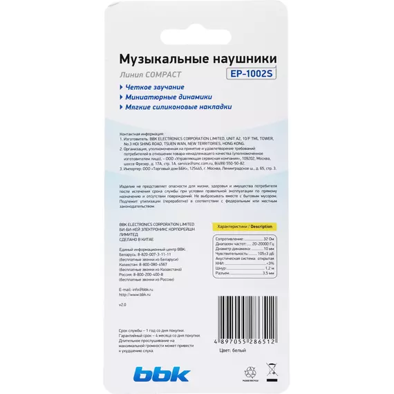 Наушники BBK EP-1002S (W) 1.2м белый проводные в ушной раковине