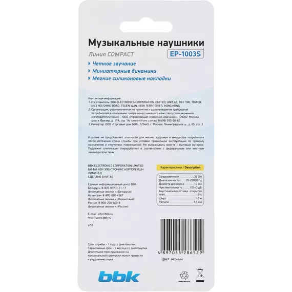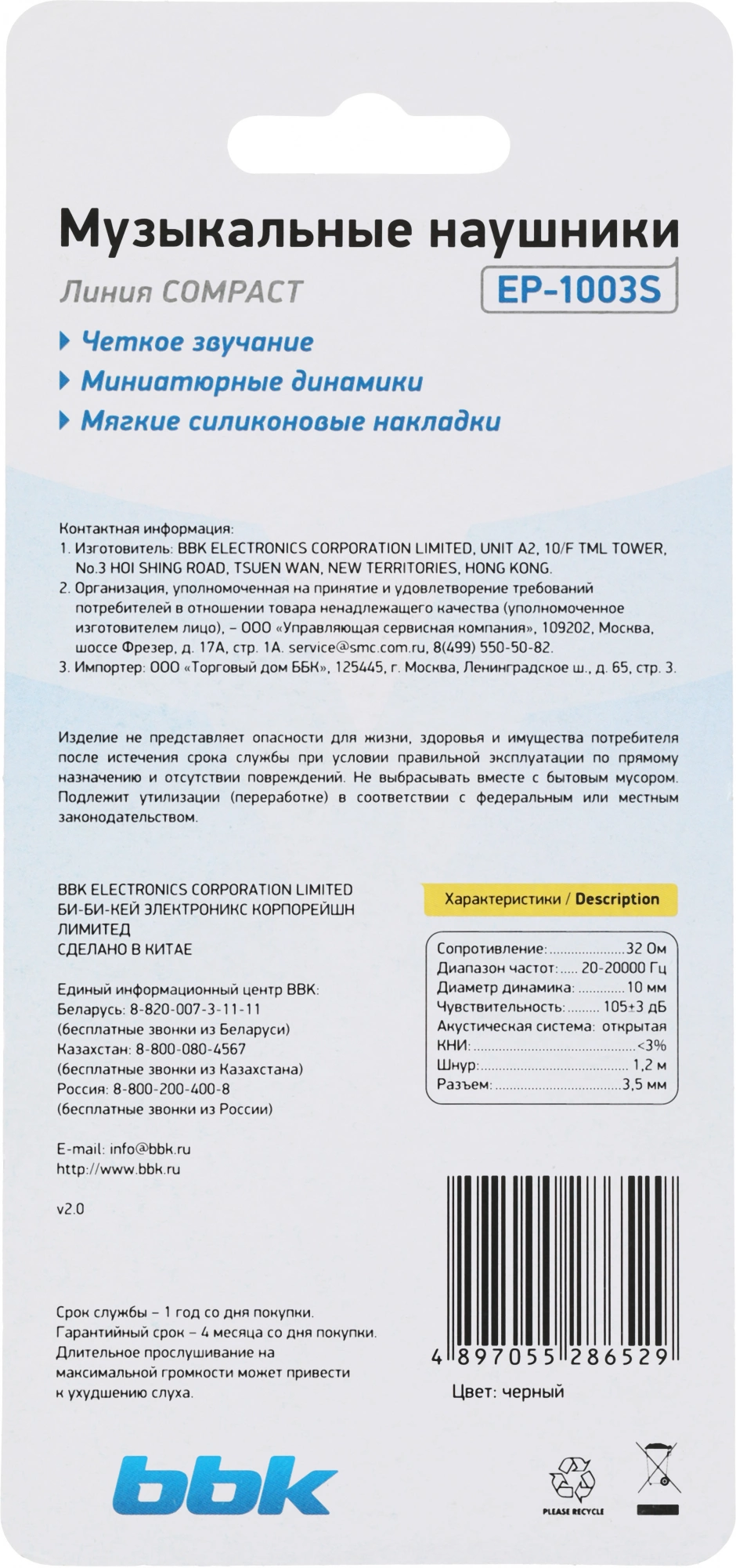 Наушники BBK EP-1003S (B) 1.2м черный проводные в ушной раковине
