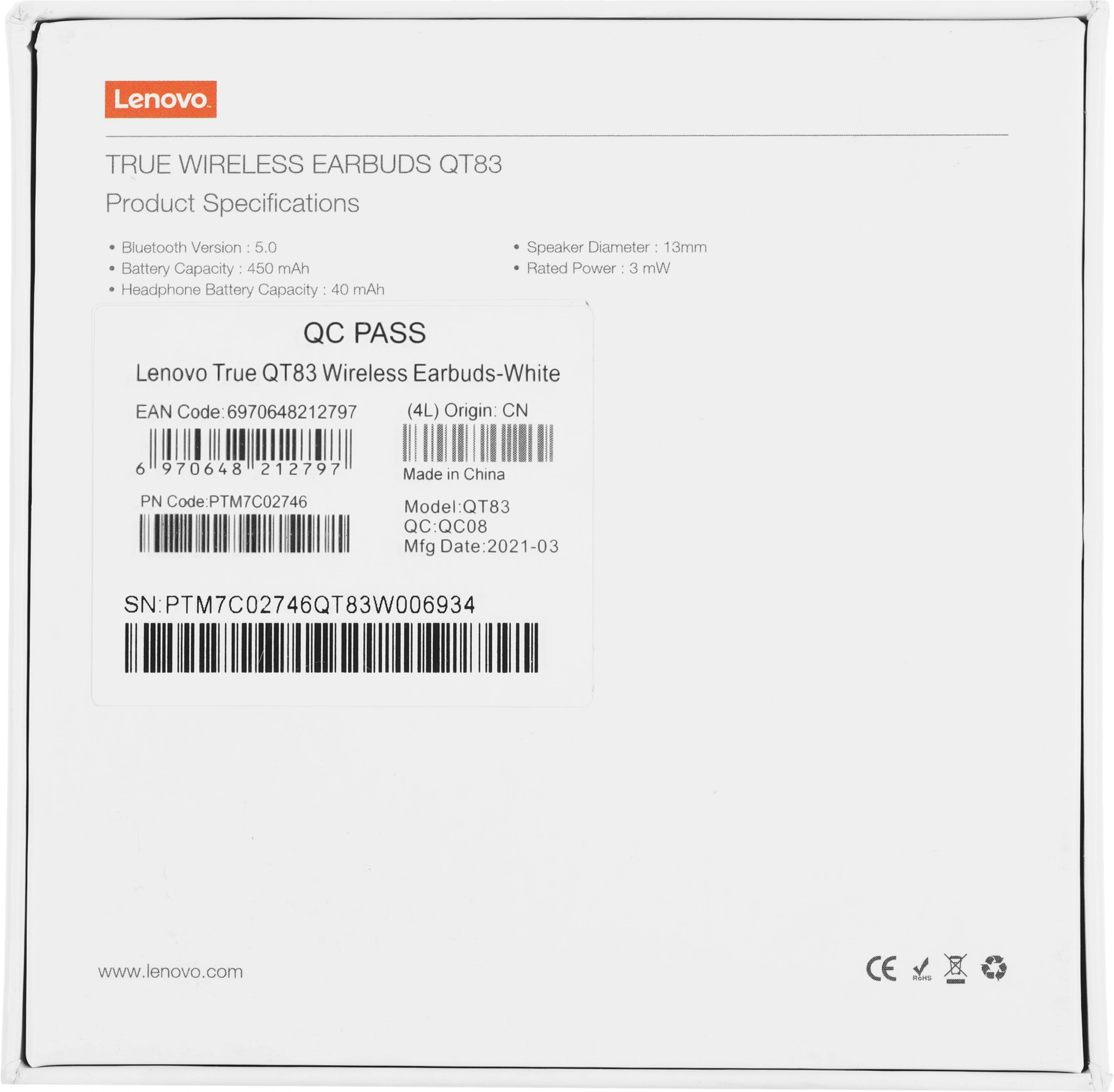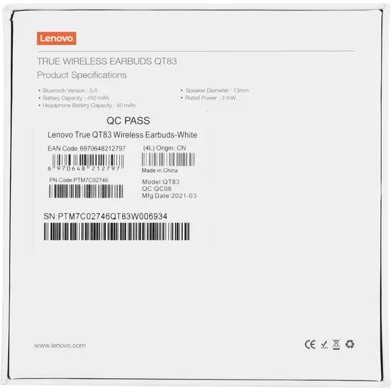 Гарнитура вкладыши Lenovo QT83 белый беспроводные bluetooth в ушной раковине