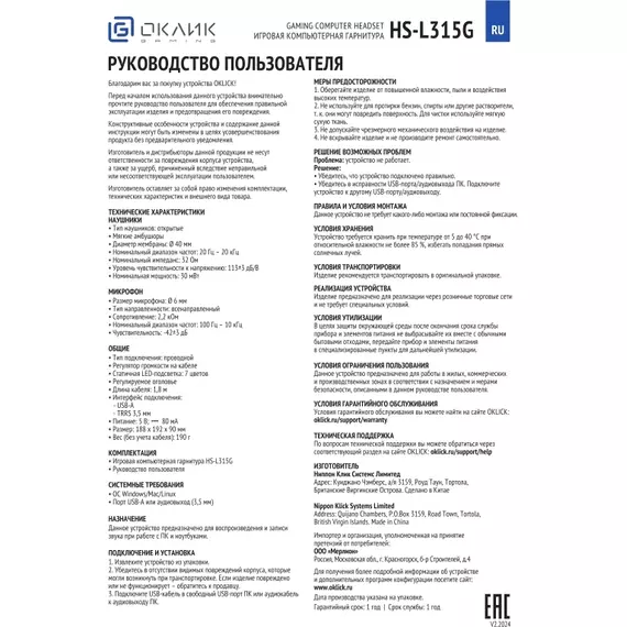 Наушники с микрофоном Oklick HS-L315G черный 1.8м накладные USB оголовье [2007552]