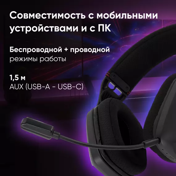 | Особенности | Облегченная гарнитура с поддержкой беспроводных (BT + 2,4G) и проводного режима, съемным микрофоном, ресивер, зарядный провод в комплекте |