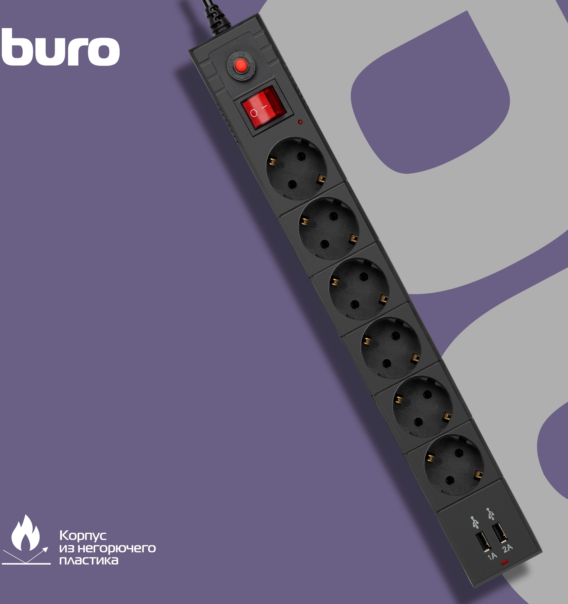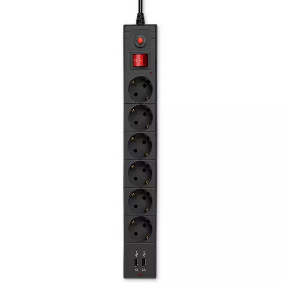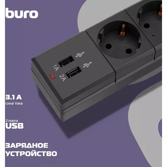 Сетевой фильтр BURO BU-SP1.8_USB_2A-B 1.8м (6 розеток) черный (коробка) [BU-SP1.8_USB_2A-B]