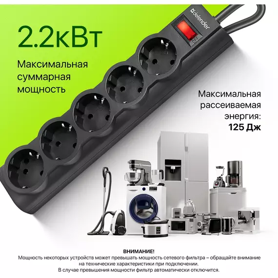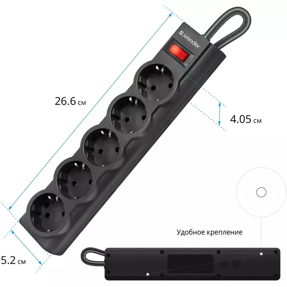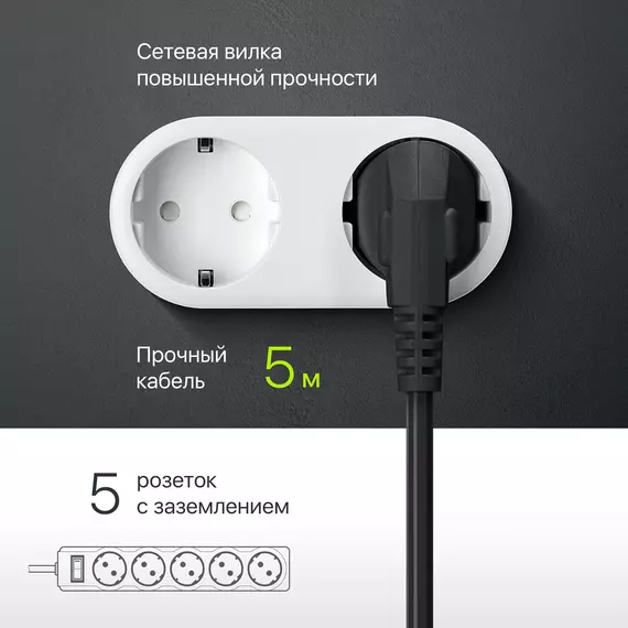| Особенности | 5 розеток с заземлением. Автоматический предохранитель, встроенный в выключатель. Защита от перегрузки и короткого замыкания. Защита от импульсных помех. Индикатор сети. Крепление на стену. Корпус из негорючего пластика. |
