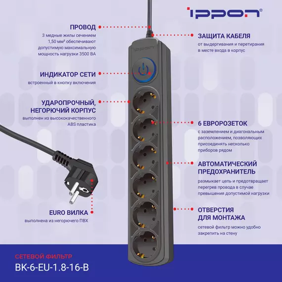 Сетевой фильтр Ippon BK-6-EU-1.8-16-B 1.8м (6 розеток) черный (коробка)