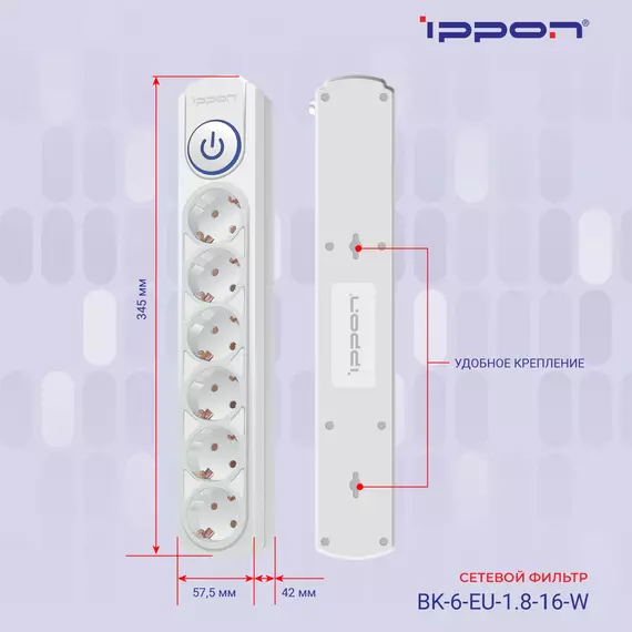 Сетевой фильтр Ippon BK-6-EU-1.8-16-W 1.8м (6 розеток) белый (коробка)