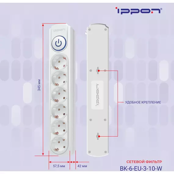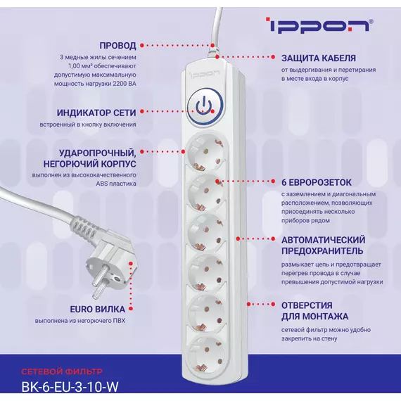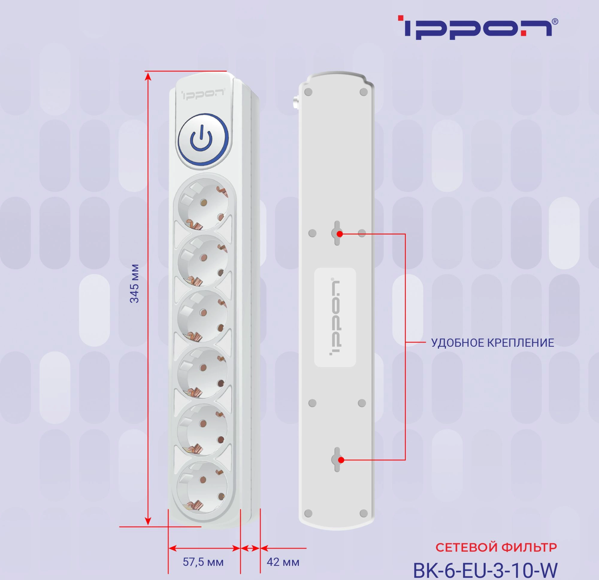Сетевой фильтр Ippon BK-6-EU-3-10-W 3м (6 розеток) белый (коробка)