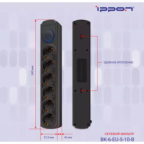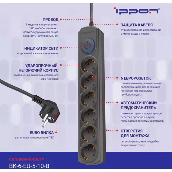Сетевой фильтр Ippon BK-6-EU-5-10-B 5м (6 розеток) черный (коробка)