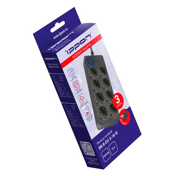 Сетевой фильтр Ippon BK-8-EU-3-16-B 3м (8 розеток) черный (коробка)