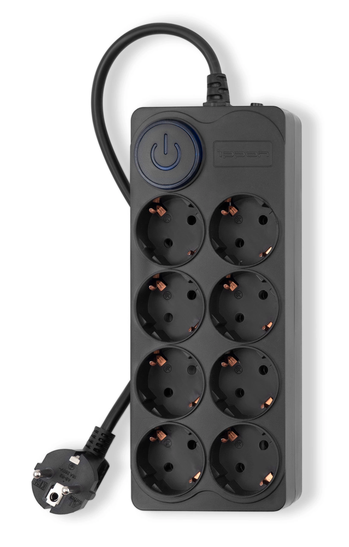 | Особенности | 8 евророзеток с заземлением. Входная вилка Schuko. Защита от перегрузки. Защита от импульсов высокого напряжения. Защита от перетирания провода в месте входа в корпус фильтра. Ударопрочный негорючий корпус. Кнопка питания с индикатором сети. |