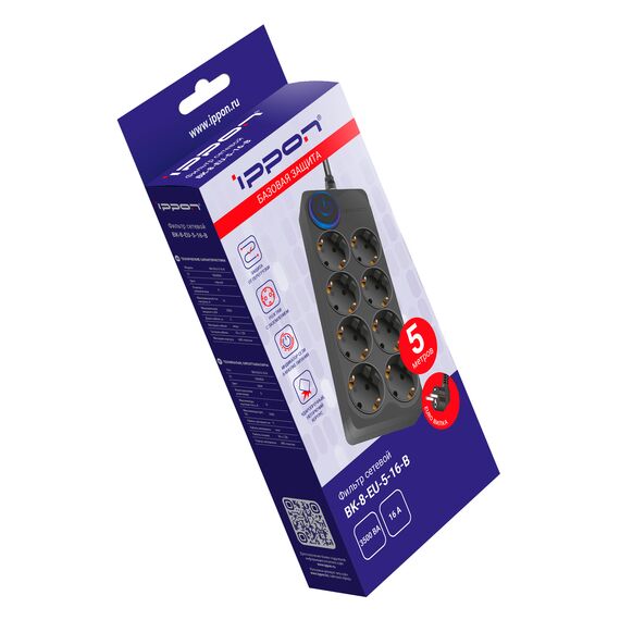 Сетевой фильтр Ippon BK-8-EU-5-16-B 5м (8 розеток) черный (коробка)