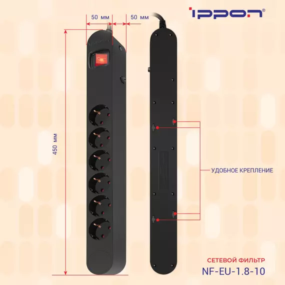 Сетевой фильтр Ippon NF-EU-1.8-10 1.8м (6 розеток) черный (коробка)