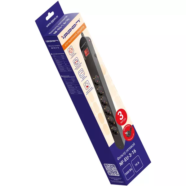 Сетевой фильтр Ippon NF-EU-3-16 3м (6 розеток) черный (коробка)