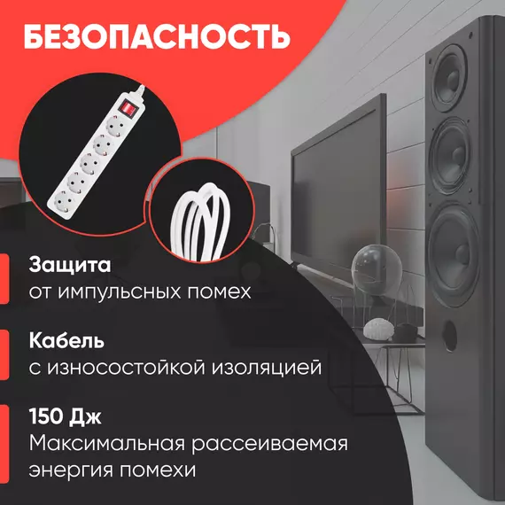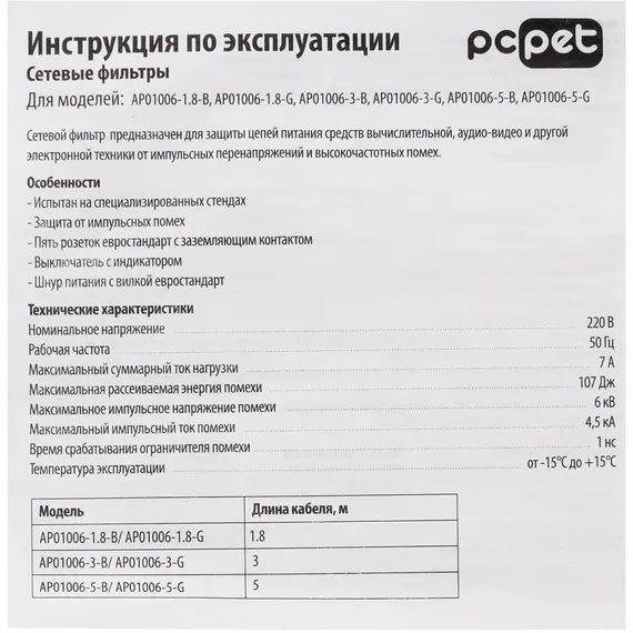 Сетевой фильтр PC Pet AP01006-1.8-G 1.8м (5 розеток) серый (пакет ПЭ)
