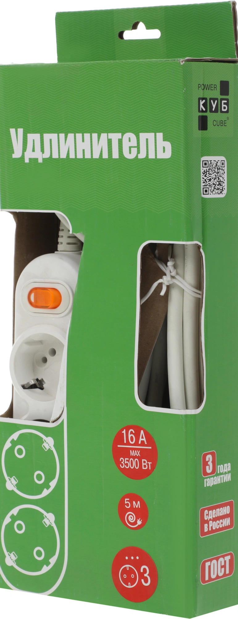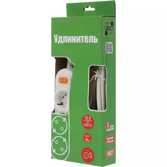 Сетевой удлинитель Powercube PC-1-5M 5м (3 розетки) белый (коробка)