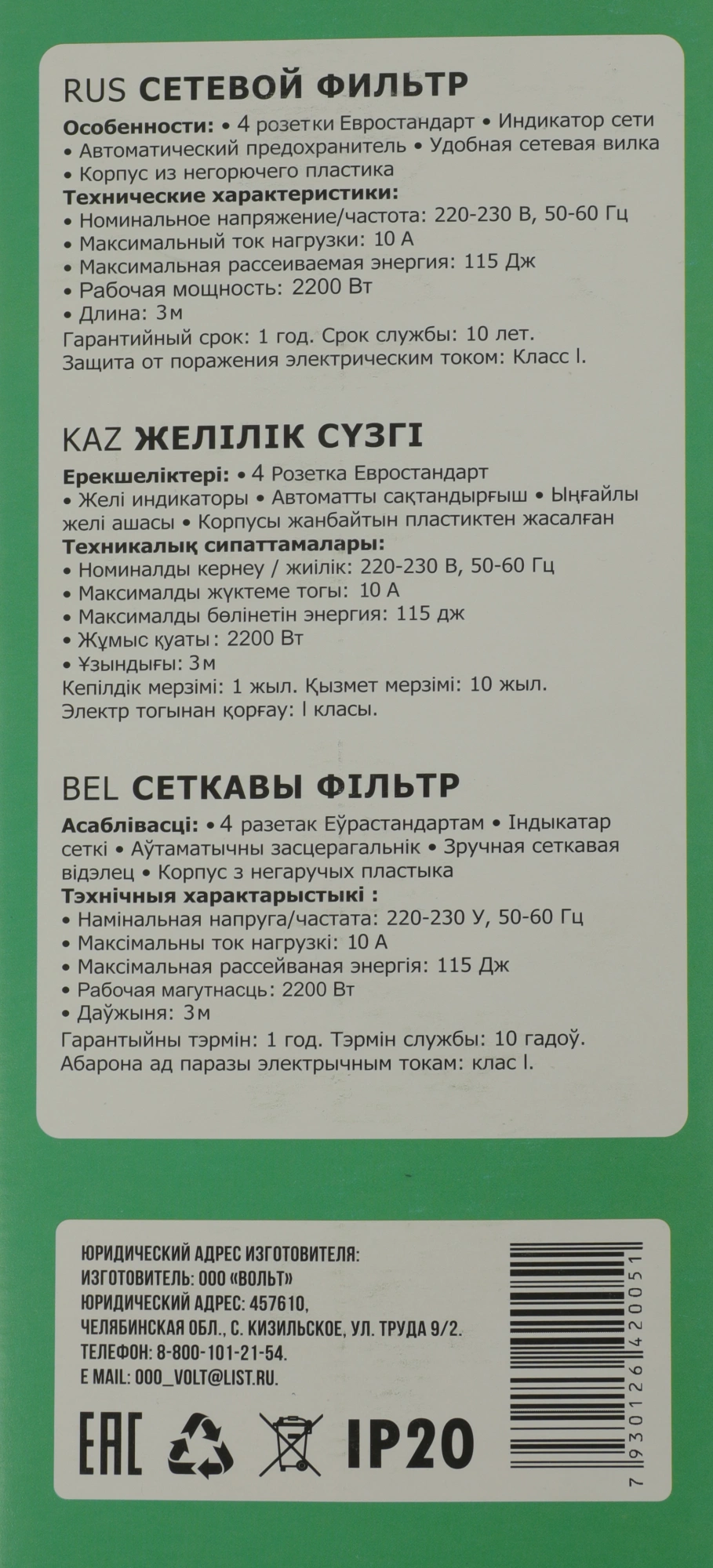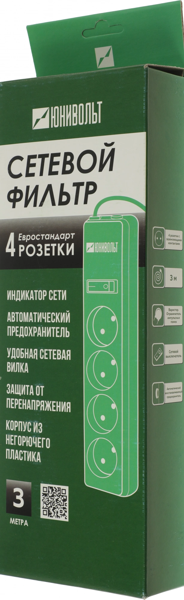 Сетевой фильтр Юнивольт 00-00000387 3м (4 розетки) белый (коробка)