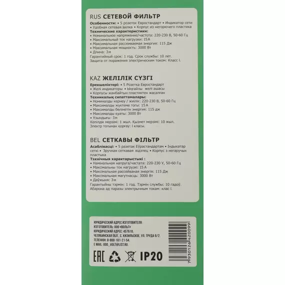 Сетевой фильтр Юнивольт 00-00000406 3м (5 розеток) белый (коробка)