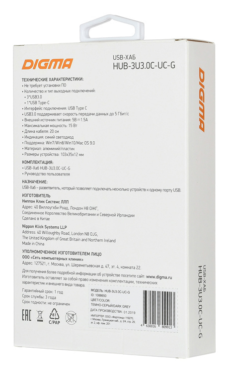 Описание Digma HUB-3U3.0С-UC-G
