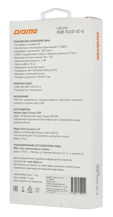 | Особенности | 7 разъемов USB 3.0. Длина кабеля 50 см. |