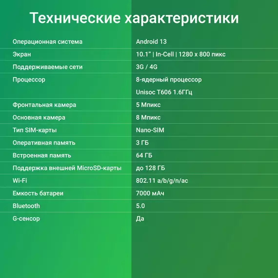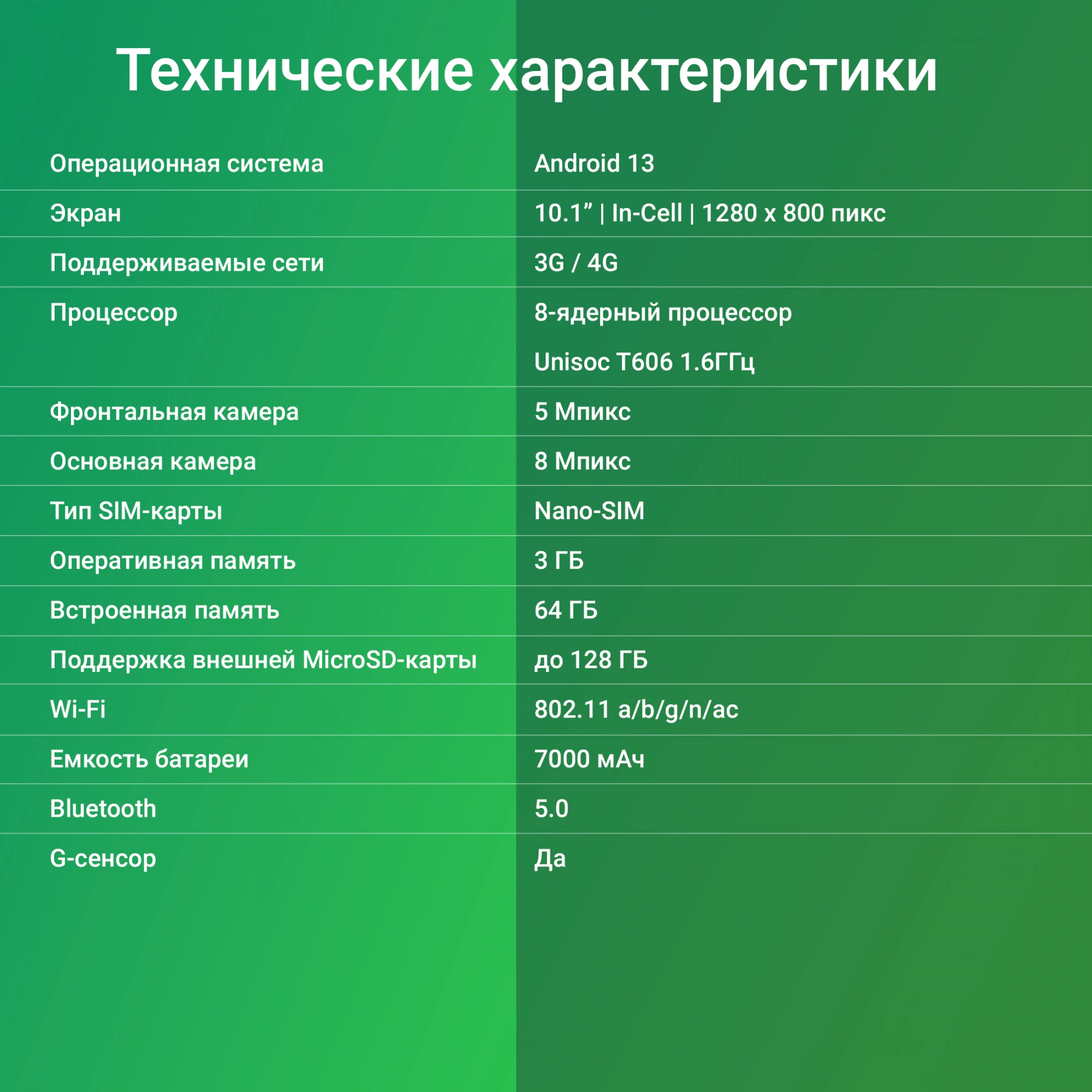 Устройство работает на операционной системе Android 13, которая обеспечивает стабильную работу и безопасность данных. Планшет обладает 3 ГБ оперативной памяти и 64 ГБ встроенной памяти, которую можно расширить с помощью карты памяти micro SD до 128 ГБ.